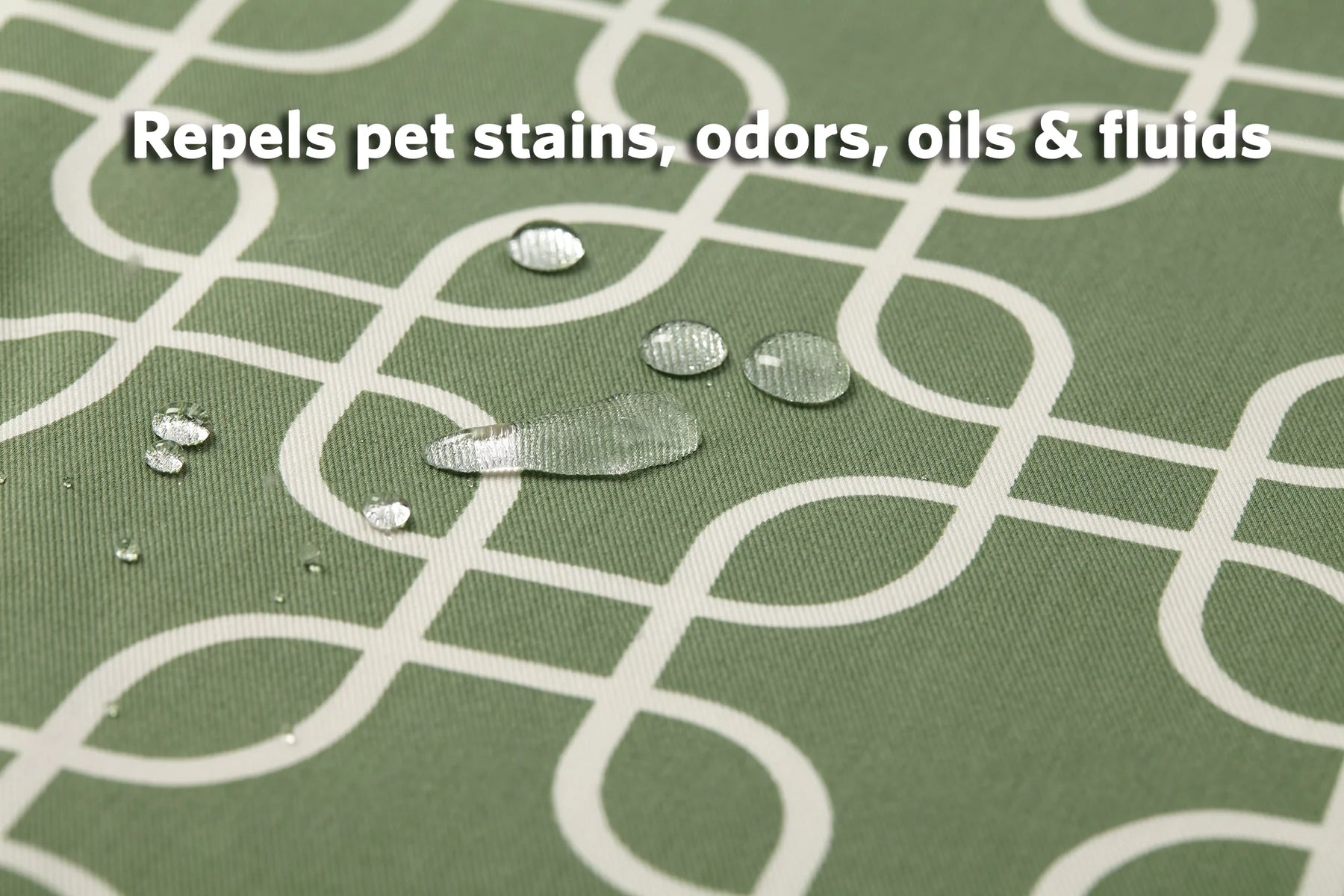 Pet bed features durable attractive green geometric pattern w/ removable zippered case | Teflon Fabric Protector repels pet stains, odors, oils & fluids